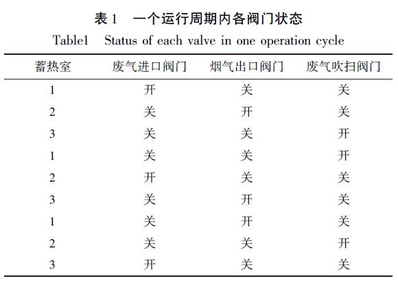 程因?yàn)槭峭ㄟ^程序控制氣動調(diào)節(jié)閥工作, 能在短時間內(nèi)切換閥門狀態(tài), 保證三個蓄熱室一次完成蓄熱、放熱和吹掃的過程。在一個運(yùn)行周期內(nèi)每個蓄熱室下的閥門切換狀態(tài)如表1 所示。