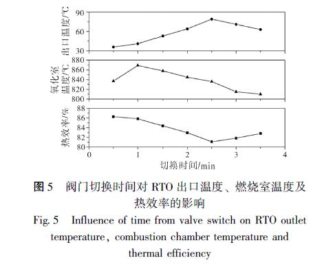 分, 不利于提高熱效率和廢氣處理效率。同時, 熱效率也隨著切換時間的增加而減少, 不利于VOCs 的高效處理和余熱利用。切換時間的逐漸增加在2 ~ 2. 5 min 時, 蓄熱室吸收的熱量增加, 導(dǎo)致蓄熱室與煙氣的溫差減小, 排氣出口溫度升高, 且燃燒室溫度和熱效率仍有降低。隨著切換時間的進(jìn)一步增加到2. 5 分鐘以上, 進(jìn)氣過程的蓄熱室溫度進(jìn)一步下降, 導(dǎo)致進(jìn)氣蓄熱體和燃燒室中的氣體溫度繼續(xù)下降, 在排氣過程中供給蓄熱體吸收的熱量減少, 排氣出口溫度開始下降, 有利于熱效率的提高。