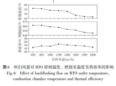 吹掃過程是通過吹掃風(fēng)機(jī)將殘留在蓄熱室內(nèi)的VOCs 帶入燃燒室, 以提高廢氣的效率[11] 。但目前RTO 反吹風(fēng)量的設(shè)計大多基于工程經(jīng)驗(yàn), 對不同工況下的實(shí)際運(yùn)行參考性不高。為了研究吹掃風(fēng)量對RTO 裝置運(yùn)行的影響, 試驗(yàn)設(shè)定在廢氣流量8000 m3 / h, 切換時間2 min 且無電加熱的條件下, 模擬吹掃風(fēng)量從600 m3 / h 增加到2000 m3 / h 時出口溫度、燃燒室溫度和熱效率變化情況。如圖6 所示。由于吹掃風(fēng)是從排至煙囪的煙氣中抽取, 實(shí)際吹掃風(fēng)中含有的VOCs 濃度較低, 無法給燃燒室提供多的。同時, 過大的吹掃風(fēng)量增加了進(jìn)入進(jìn)氣和排氣蓄熱室的流量, 降低了實(shí)際發(fā)生氧化反應(yīng)的廢氣的預(yù)熱溫度, 且降低了出口溫度。雖然熱效率在1200 m3 / h 吹掃風(fēng)量附近有一定程度的增加, 但結(jié)合燃燒室溫度和經(jīng)濟(jì)因素,800 ~1000 m3 / h 區(qū)間內(nèi)較為合理與實(shí)際工程經(jīng)驗(yàn)吹掃風(fēng)量占進(jìn)氣流量的10% 左右結(jié)論相近[12] 。同時可以看出, 吹掃風(fēng)量越大, 燃燒室的溫度越低, 需要開啟電加熱器提供熱量來提高燃燒室的溫度, 增加運(yùn)行成本。