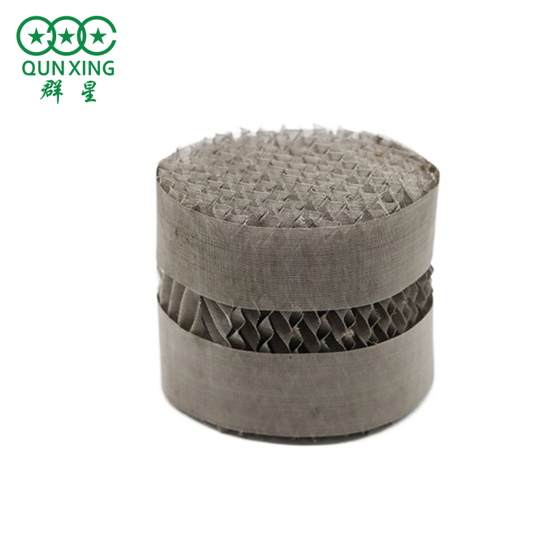 (2)應(yīng)用范圍金屬壓延刺孔板波紋填料由于表面特殊的刺微孔結(jié)構(gòu),增加了填料的毛細作用,使填料的潤濕性升高,所以在精餾與吸收的試驗中呈現(xiàn)出良好的分離性能,經(jīng)過預(yù)液泛后可增加填料效率?,F(xiàn)在主要有45、6.3、10型三種,其主要特點是流量較大時基本保持了金屬絲網(wǎng)波紋填料的優(yōu)良分離功能,又省去了拉絲編網(wǎng)的復(fù)雜工序,降低了填料造價。4.5 型、6.3型話用于分離要求較高的精細化工、溶劑回收、化工產(chǎn)品精制等領(lǐng)域:而10型填料屬于通量大、壓降小的通用型規(guī)整填料,在一般化工、石油化工、化肥、H保等領(lǐng)域有著廣泛的應(yīng)用前景,